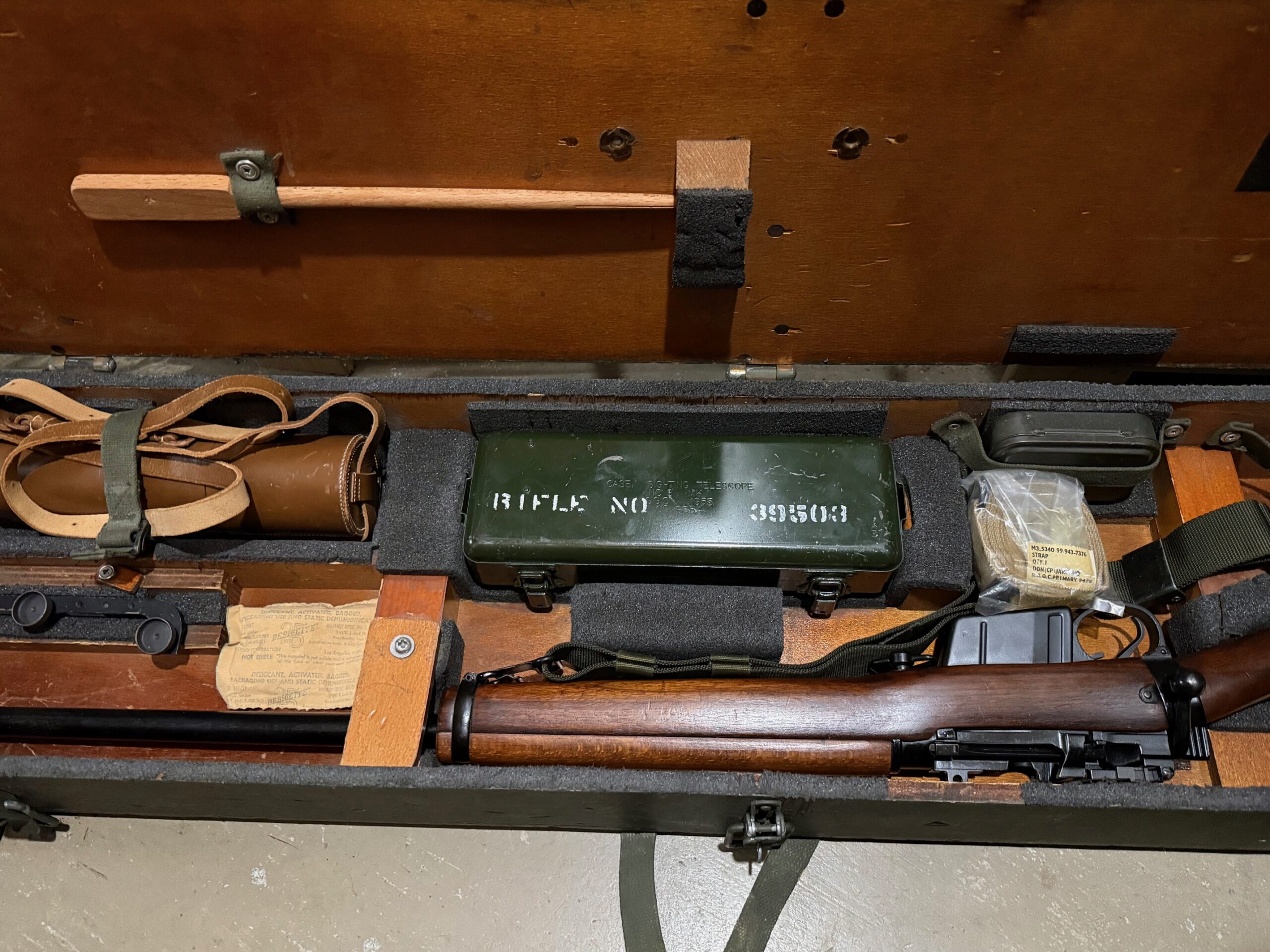 L42A1 - Centre section in transit chest. Showing 1955 dated No. 8 MK. I scope case (mismatched) NOS scope case strap in packaging, cleaning kit stowed, rifle and sling, chamber cleaning stick.