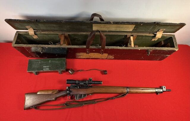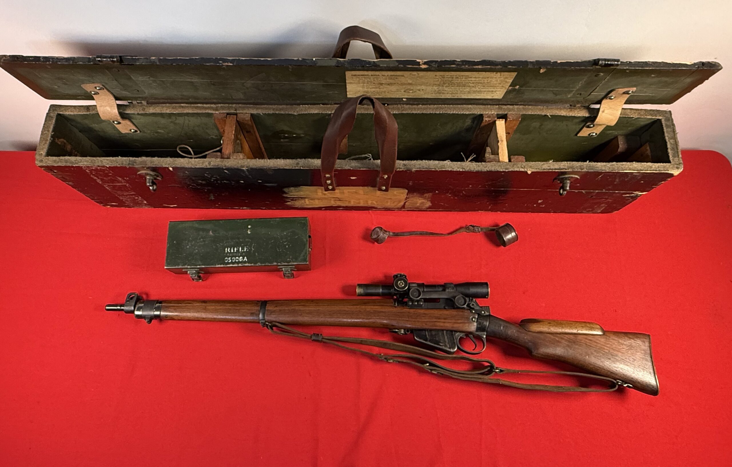 $9,000 CAD - No. 4 Mk. I (T) MATCHING sniper rifle complete with a scope case (numbers had been removed) and a No. 15 Mk. I wooden transit chest.
