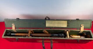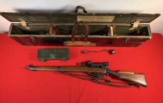 $17,900 CAD L42A1 sniper rifle with COMPLETE kit. Matched set. includes L42A1 transit chest, manuals, chamber cleaning stick, slings (M1907 and L8 synthetic), 1955 dated No. 8 Mk. I scope case (numbers do NOT match this set), cleaning kit, Scout Regiment Telescope in is leather case, rare original "J" bracket for IWS and the very rare lens brush and even more rare plastic bottle for it.