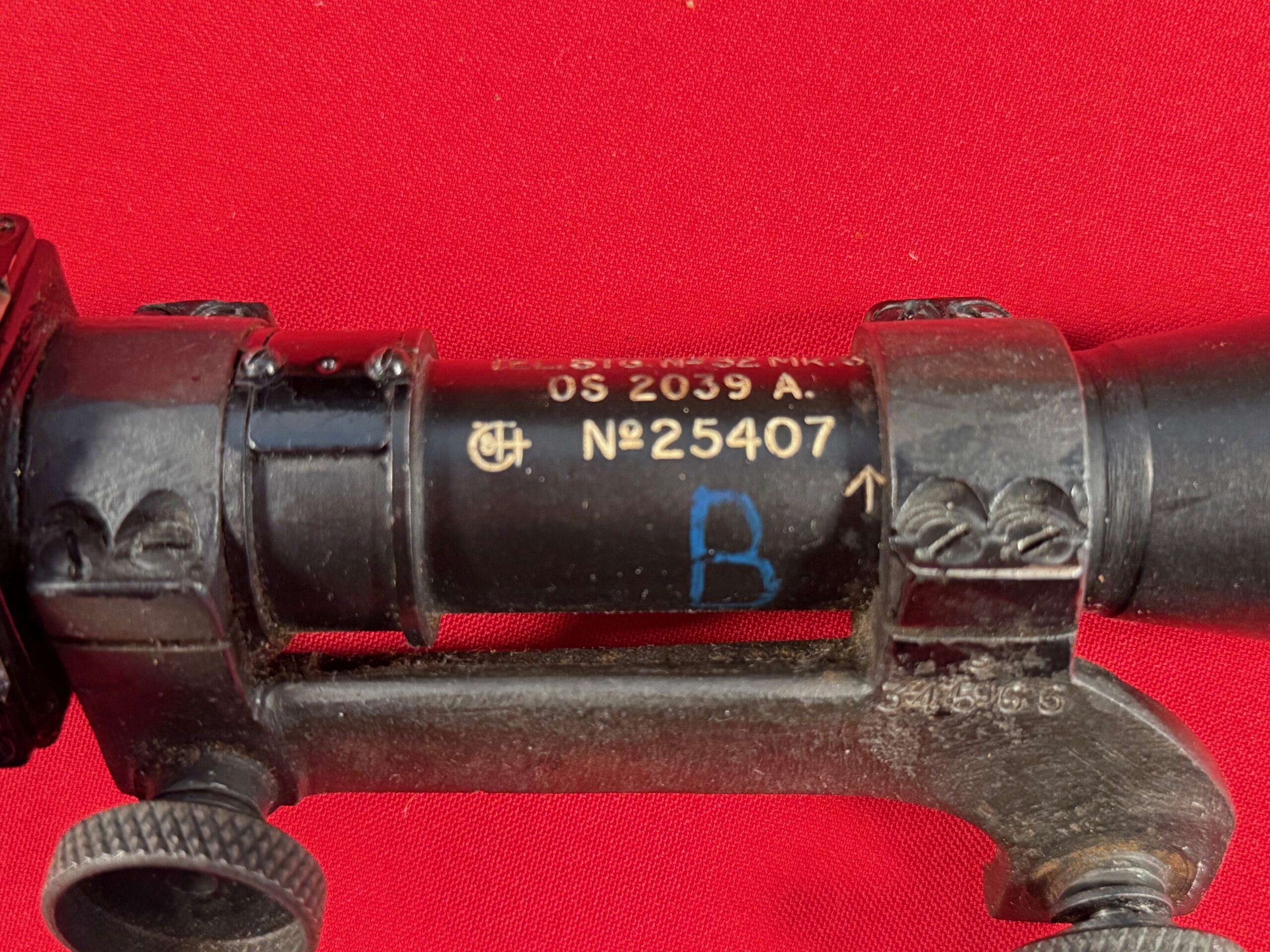 Scope is a British No. 32 Mk. III OS. 2039A made by AK&S in 1945. serial number 23680. White "B" painted on MAY be that lens was bloomed for better light gathering. Original scope caps OS 12419 A.G. & Co. LTD.