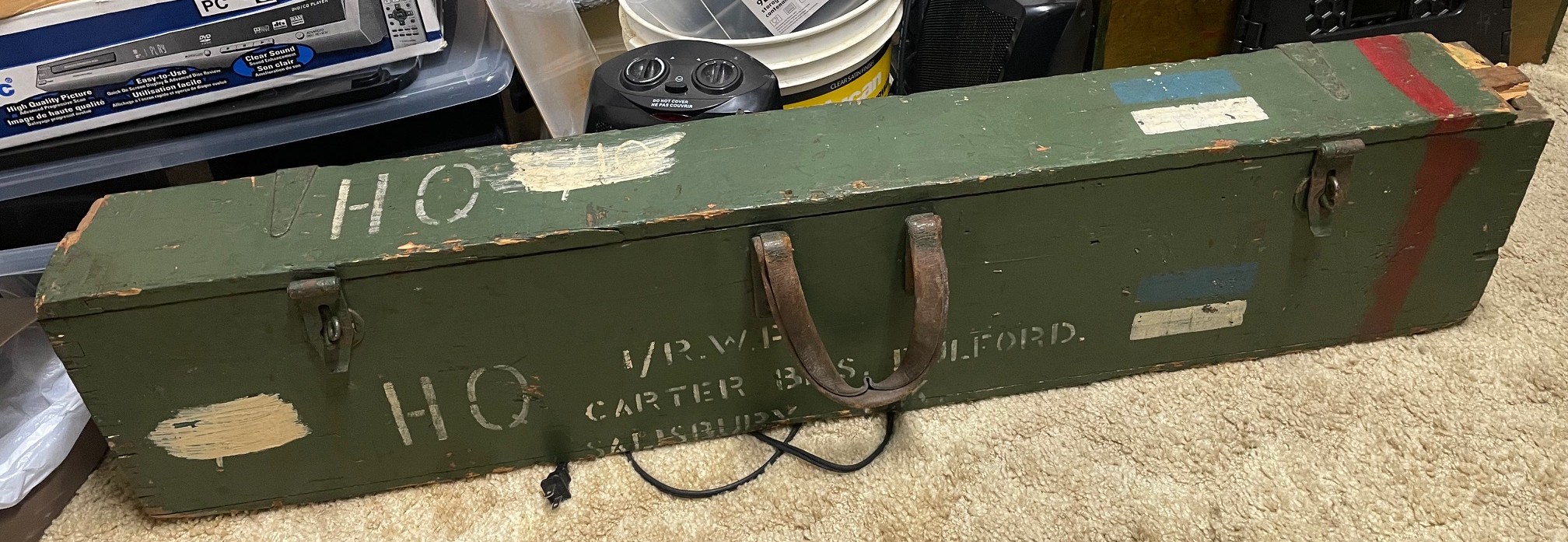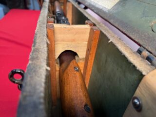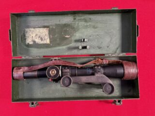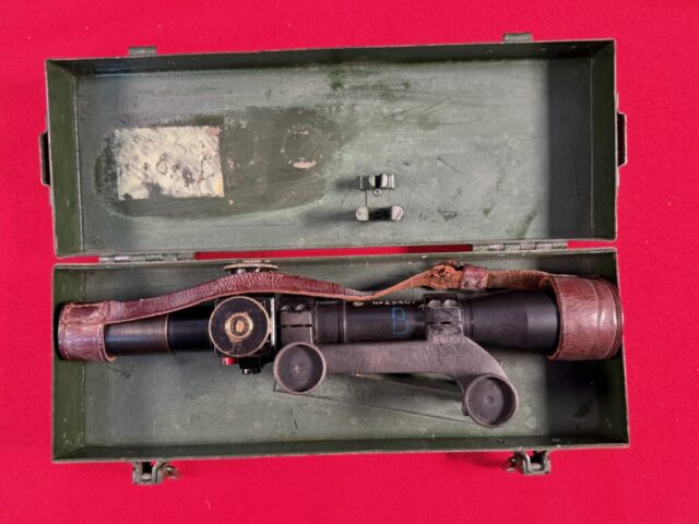 L42A1 – Left section in transit chest. Showing 1955 dated No. 8 MK. I scope case (mismatched) , Scout Regiment Telescope in its case, rare original “J” bracket to mount IWS, rifle and sling, chamber cleaning stick.