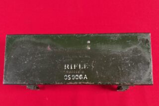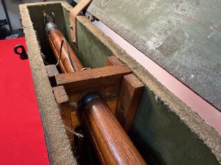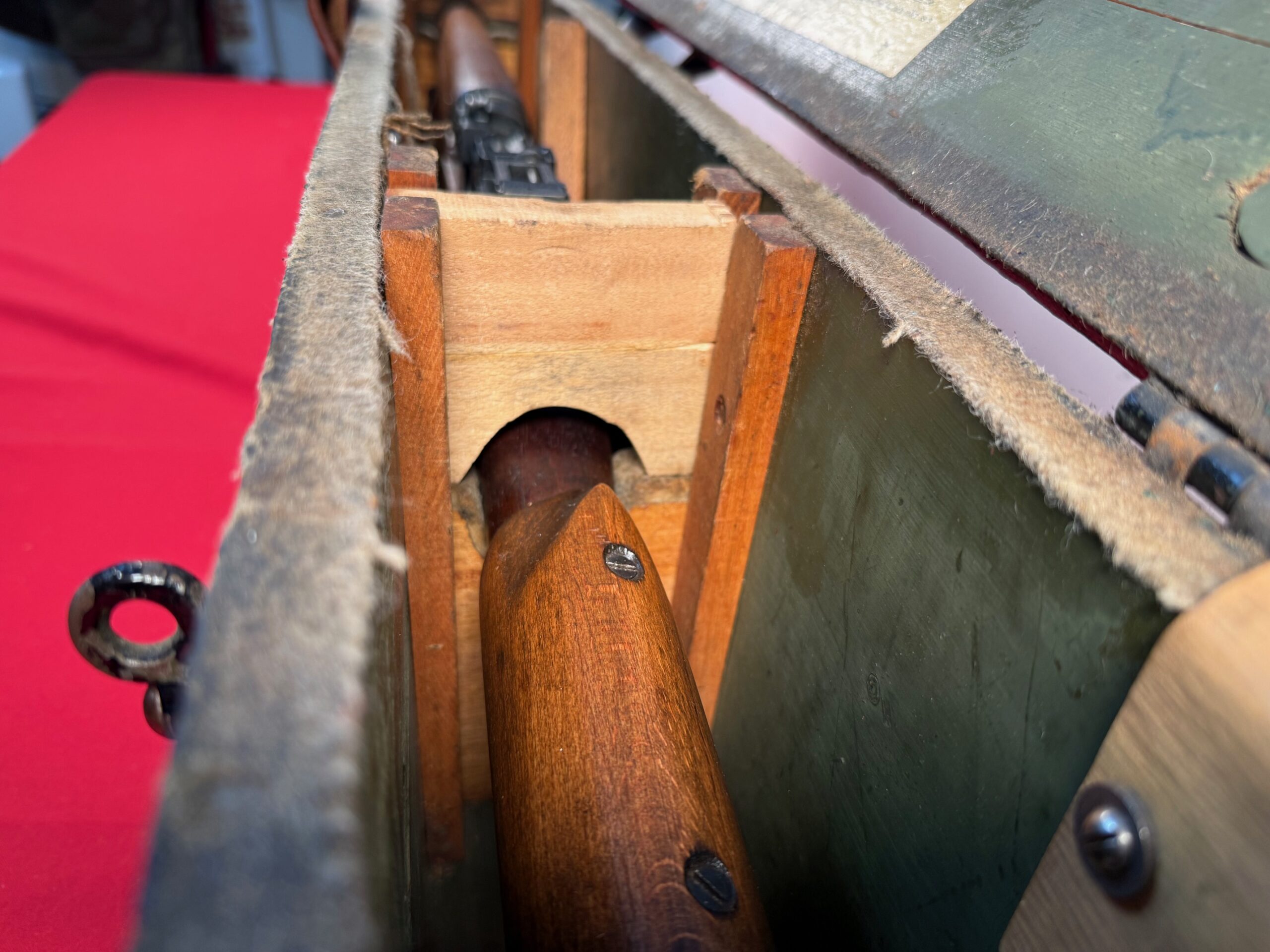 L42A1 – Centre section in transit chest. Showing 1955 dated No. 8 MK. I scope case (mismatched) NOS scope case strap in packaging, cleaning kit stowed, rifle and sling, chamber cleaning stick.