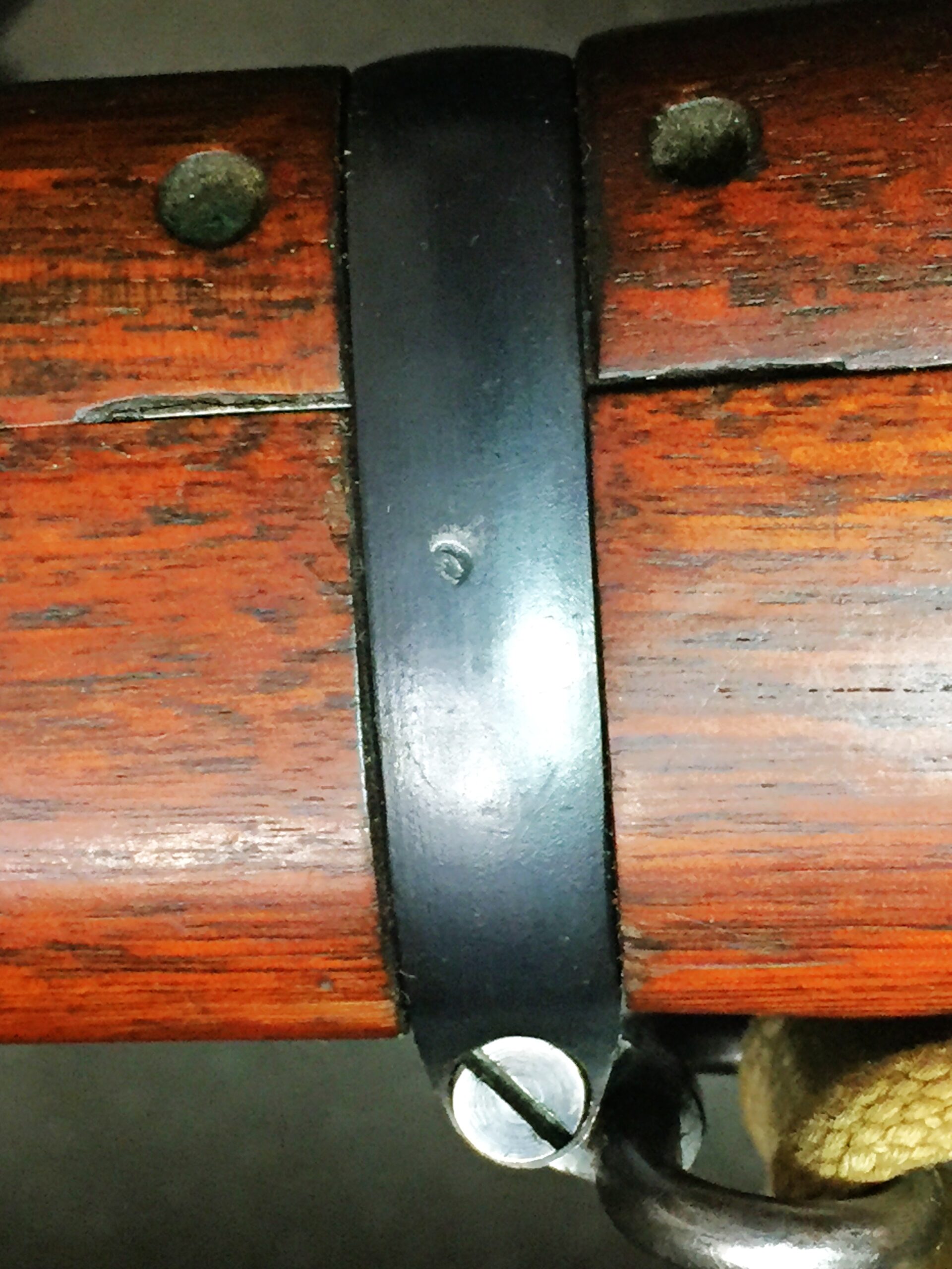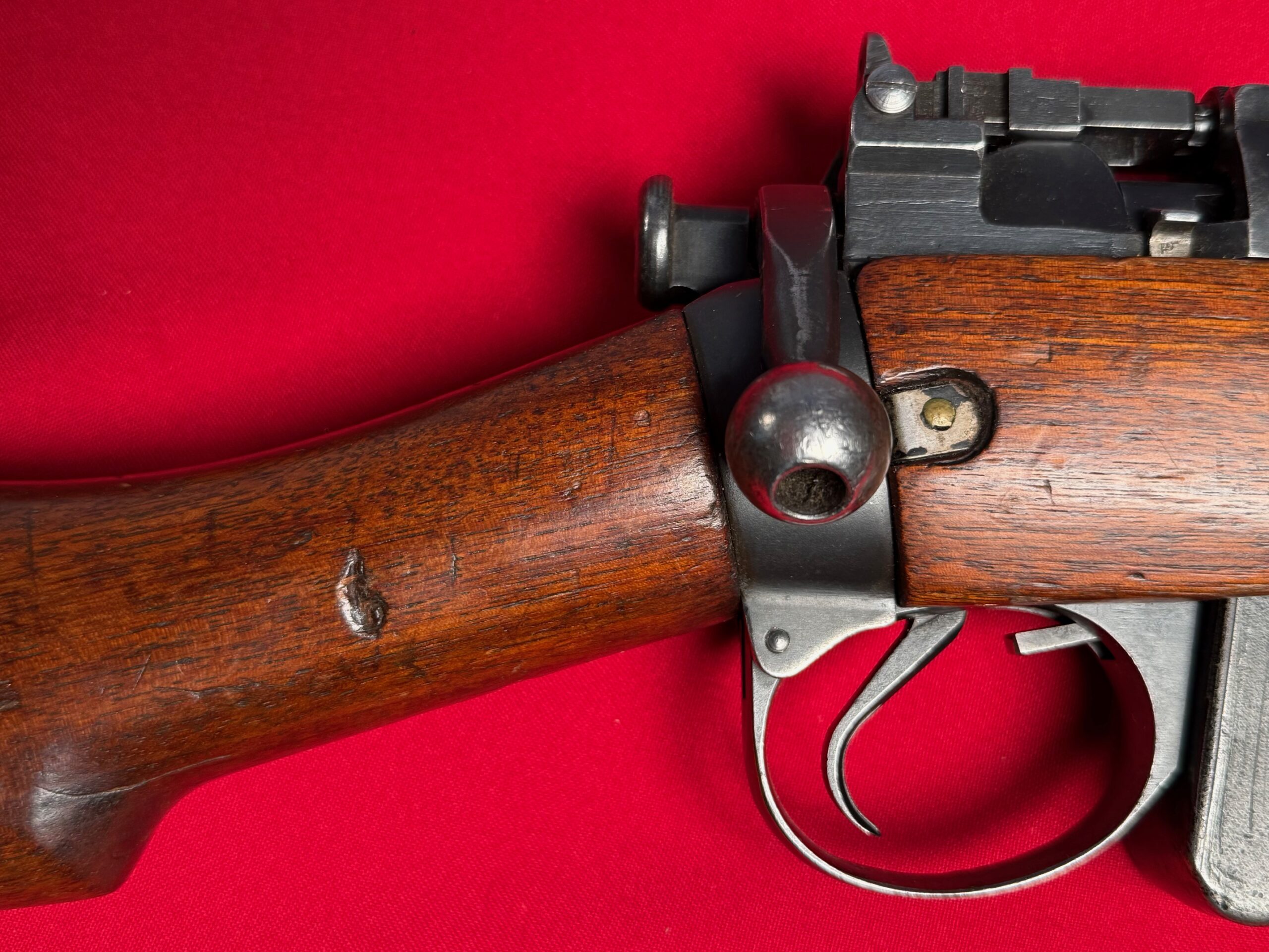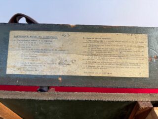 Chest No. 15 Mk. I which matches, shows it was issued to "1RWF" (1st Battalion Royal Welch Fuzileers - the spelling has since changed to Royal Welsh Fusiliers). Wrist of butt shows that this is the third scope officially matched to this rifle insicating that it had long service use.