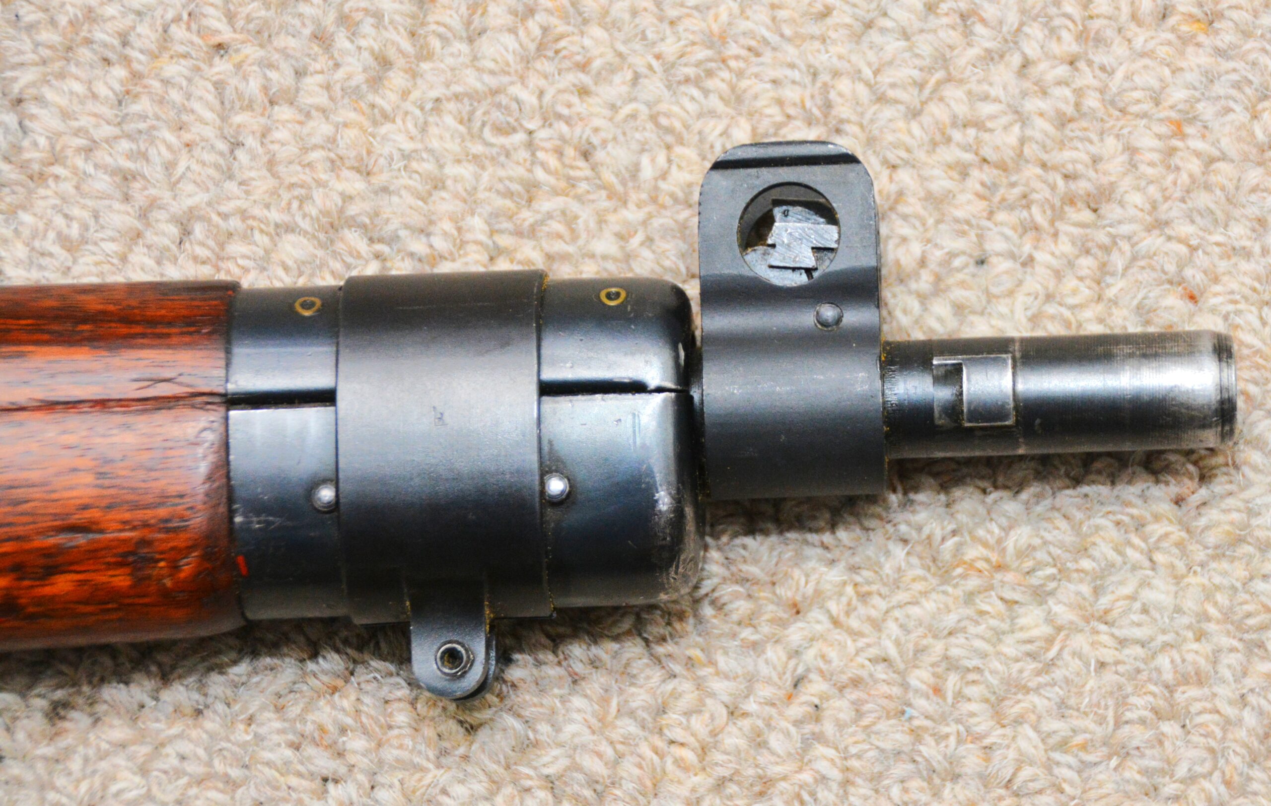 Very rare Long Branch early wasp waist front sight protector, hinged upper band, and Mk. I cocking piece. Long Branch rear sight Mk. I.
