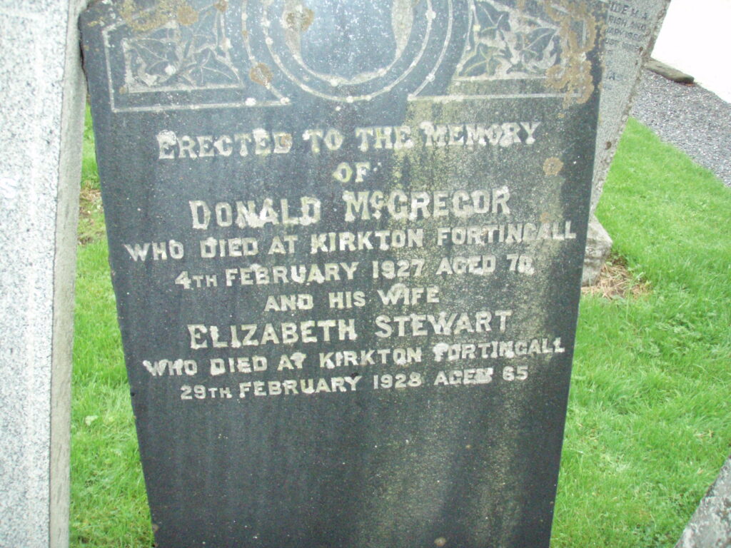 === // In Loving Memory of Jessie (a MacGregor grave) === // Erected by Donald MacGregor late of the 33rd Regiment in memory of his parents John MacGregor 17th August 1798 Aged 51 (?) years and wife Flora MacNaughton who died 13th March 1832 Aged 83 years. === “In loving memory of Helen McGregor who died at Artrascart 1st Jany. 1927 Aged 84 Years” ===
