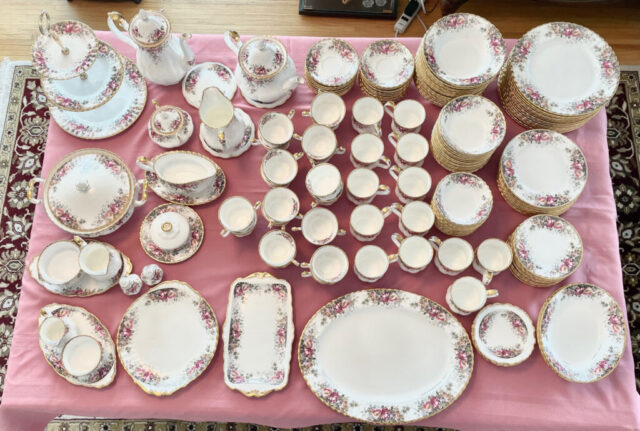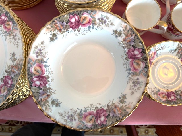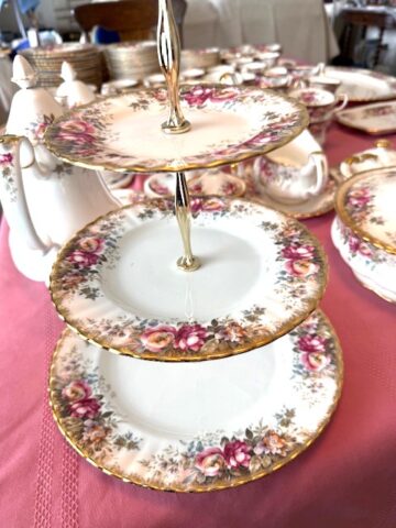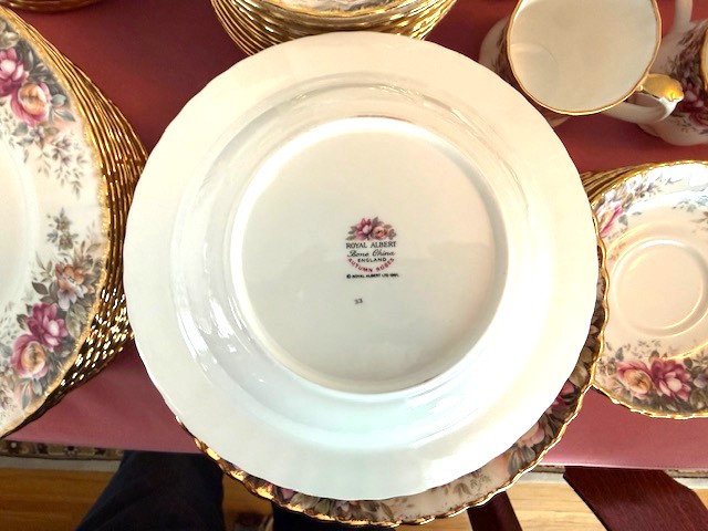 The three-tier cake was unpacked from its sealed factory box and assembled for the photosgraphs. Real gold trim. The dishes “ping” when tapped and we shall also give them the light test *should be able to see the light shone through the botton of cups etc.